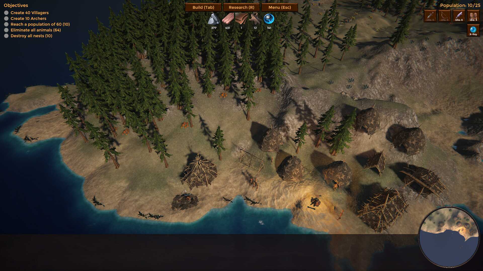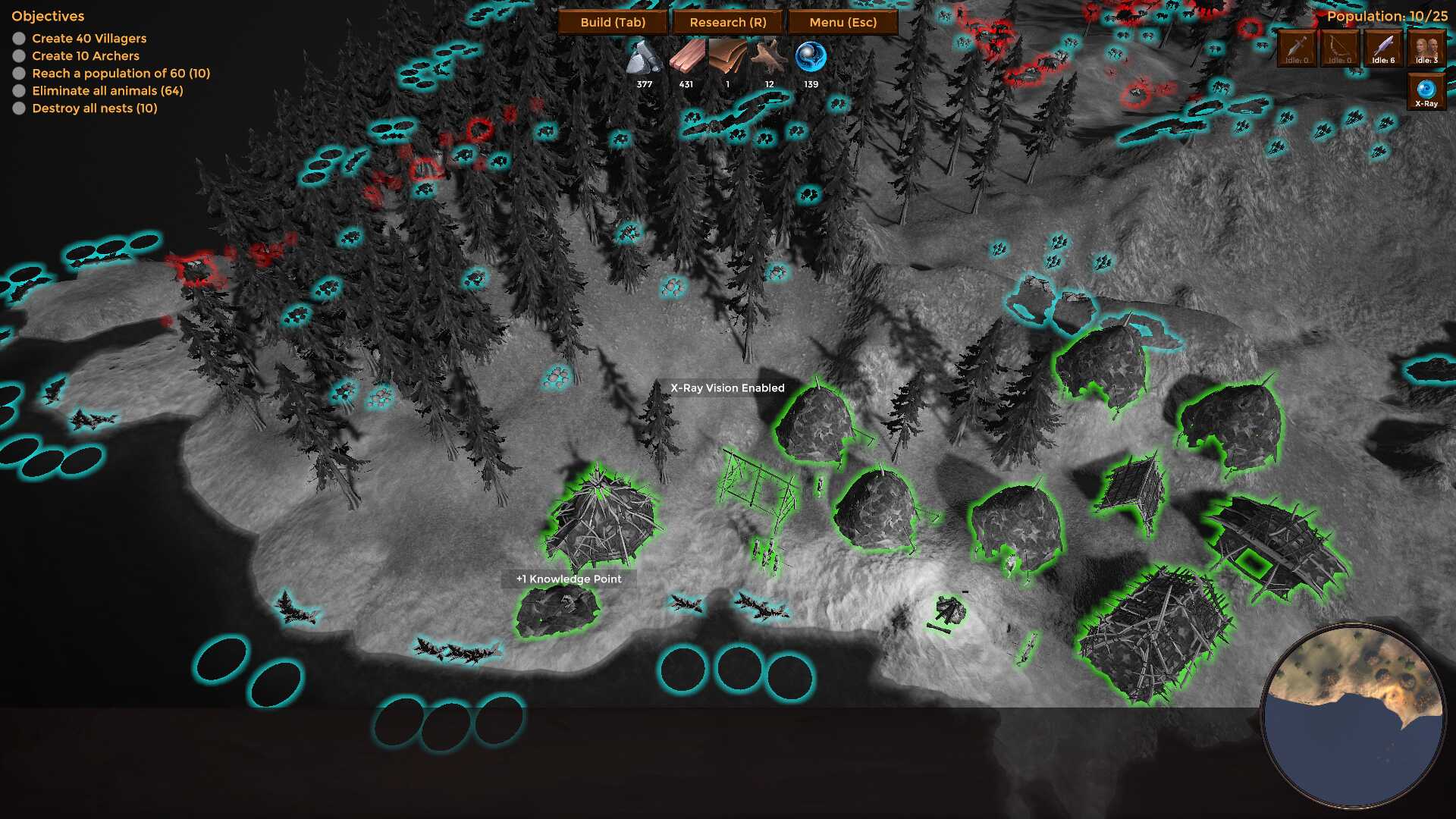 - Added X-Ray Vision: When researched and activated (by icon or pressing 'V') it consumes Knowledge Points while active, and it will show the world in grayscale, with all your structures/units light up in green, resources in blue and animals/nests in red. With the X-Ray vision it's much easier to locate hidden stuff behind a bunch of trees.